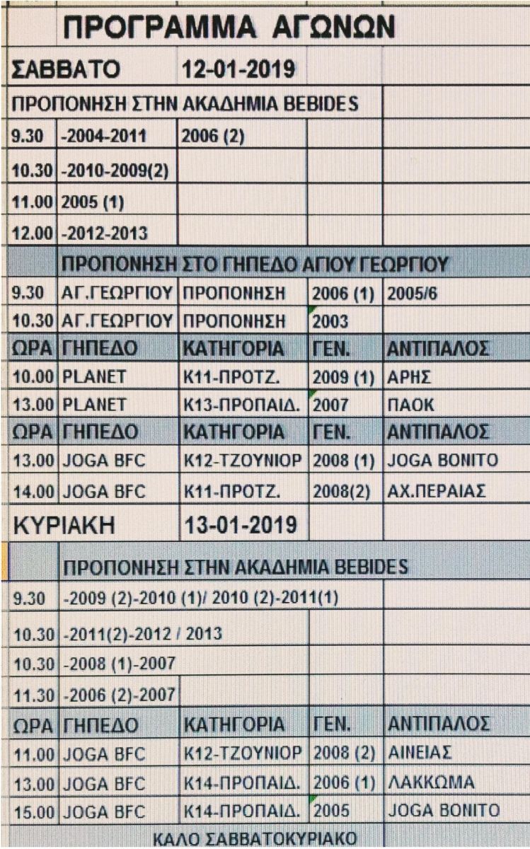 ΠΡΟΓΡΑΜΜΑ ΑΓΩΝΩΝ (12-13/01/2019)